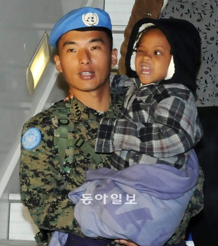 아이티에서 대지진 피해 복구활동을 해 온 단비부대의 한 요원이 24일 치료를 위해 귀국길에 동행한 아이티 심장병 어린이를 안고 전세기에서 내리고 있다. 유엔 평화유지군의 일원으로 아이티에 파병돼 2년 10개월간 활동한 단비부대는 이날 해단식을 끝으로 파병 역사의 한 페이지로 남게 됐다.