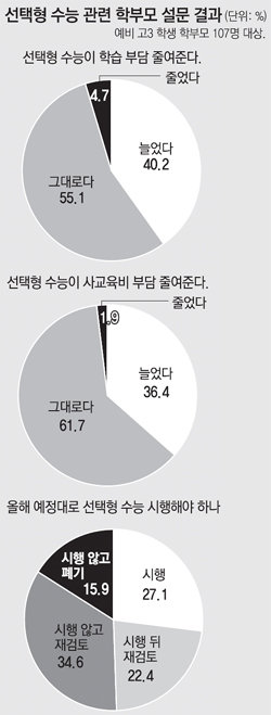 본보가 입시전문업체 ㈜하늘교육과 함께 12, 13일 예비 고교 3학년 학부모 107명을 대상으로 실시한 긴급 설문조사에서 ‘선택형 수능이 학습 부담을 줄여주나’라는 물음에 55.1%가 ‘부담이 그대로다’라고 답했고 40.2%는 ‘부담이 늘었다’고 밝혔다. 학습 부담이 줄었다는 응답은 4.7%에 그쳤다.