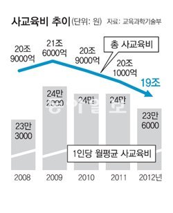 조사에 따르면 지난해 총 사교육비는 19조 원. 교과부가 사교육비 조사를 시작한 2007년 이래 처음으로 20조 원 아래로 내려갔다. 매년 증가세를 보이던 사교육비는 2009년을 정점으로 점차 줄었다. 특히 지난해는 2011년(20조1000억 원)보다 1조1000억 원(5.4%) 줄어 감소폭이 컸다. 물가를 반영해 산정한 실질 사교육비는 17조4000억 원으로 전년 대비 2조 원 줄었다.