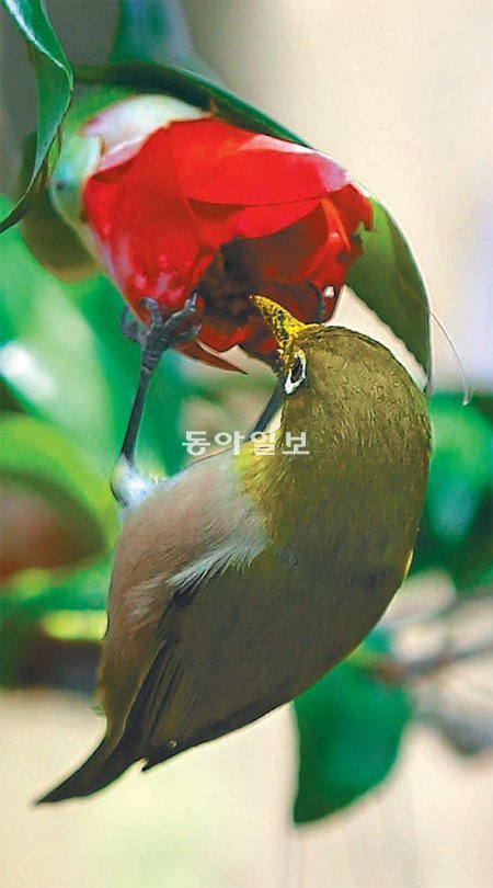 동백꽃 만개한 제주도는 이미 봄내음이 가득하다. 21일 제주시 한림읍 한림리의 한 가정집에 핀 동백꽃에 앉은 동박새 한 마리가 꿀을 따먹고 있다. 동백은 동박새에게 꿀을 내주는 과정을 거쳐 수정한다.