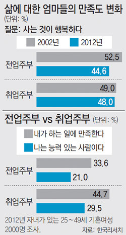 한국리서치 조사(자녀가 있는 25∼49세 기혼여성 대상)에 따르면 “사는 것이 행복하다”는 전업주부의 비율은 2002년 52.5%에서 지난해 44.6%로 하락했다. 반면 삶이 행복하다는 취업주부의 비율은 2002년 49%에서 2012년 48%로 거의 변화가 없었다.