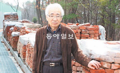 김정동 교수가 신학관 신축 현장에서 신학관 건축에 쓰일 옛 목동캠퍼스 신학관의 벽돌을 만져 보고 있다. 그는 신학관을 해체할 당시 이 벽돌을 손수 모아 보관해 왔다. 목원대 제공1999년 4월 대전 중구 목동 목원대 옛 캠퍼스. 캠퍼스 이전 작업으로 아무도 목동캠퍼스에 눈을 돌리지 않던 당시 근대건축사의 대가인 이 대학 건축학부 김정동 교수(65)는 신학관 철거 현장에 매일 출근하다시피 했다. 작업복 차림으로 현장을 찾은 그는 넝마주이처럼 신학관을 이루고 있던 벽돌을 하나 둘 주워 자신의 차량에 실은 뒤 도안동 새 캠퍼스로 날랐다. 이렇게 모은 벽돌은 무려 4만 장에 이른다. 그는 벽돌이 눈비를 맞아 상할 것을 우려해 땅을 파고 묻어 놓았다. 철거 회사는 김 교수가 찾아오는 것이 달갑지 않았다. 아파트를 짓기 위해 건물을 불도저로 빨리 밀어 버려야 할 텐데 자꾸만 건축 재료가 훼손되지 않도록 잘 분해해 달라고 부탁해 오기 때문이었다. 김 교수는 이렇게 해체한 창틀과 문짝, 물받이, 현판 등을 수거해 자신의 연구실에 차곡차곡 쌓아 보관했다. 그의 연구실은 책을 찾기도 어려울 만큼 창고로 변해 갔다. 귀중한 근대건축물을 그대로 버려서는 안 될 뿐 아니라 언젠가는 신학관을 복원할 날이 올 것이라는 믿음 때문이었다. “신학관은 1956년에 세워졌는데 경제사회적으로 어려웠던 1950년대에는 전국적으로 이렇다 할 건축물이 거의 지어지지 않아 근대건축사의 명맥을 잇고 있어요. 수많은 신학자를 배출한 기독교 학원인 목원대의 정체성을 보여 주기도 하지요.”