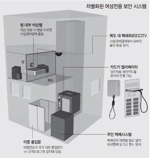 서울 마포구 노고산동의 여성전용 P오피스텔에는 경비원이 24시간 상주하면서 오후 8시부터 오전 4시 사이 남성 출입을 전면 통제한다. 거주자의 가족이라도 남성이 찾아오려면 전날 미리 경비실에 알려야 한다. 이 오피스텔의 엘리베이터는 내부에 설치된 카드꽂이에 거주자용 보안카드를 꽂아야 층별 버튼을 누를 수 있게 돼 있다.
