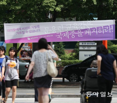 셔틀버스 정류장 앞 “국제중 폐지” 현수막