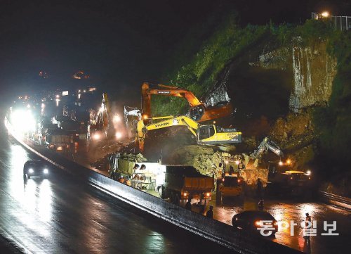 경부고속도 영천IC 부근서 산사태 경부고속도로 경북 영천 나들목에서 서울 방향으로 2km 떨어진 지점의 도로 옆 산 절개지가 5일 오후 2시 40분경 무너져 서울 방향 3개 차로가 전면 통제됐다. 한국도로공사는 굴착기 등 중장비를 투입해 밤늦게까지 긴급 복구 공사를 벌였다. 영천=양회성 기자 yohan@donga.com