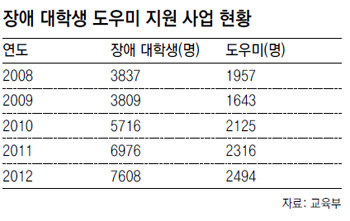 장애대학생 도우미는 지체장애인의 외출을 돕거나, 청각장애인을 위해 통역을 한다. 주로 같은 학교에 다니는 학생 중에서 뽑는다. 정부와 대학의 지원으로 활동비를 받으며 봉사시간도 인정된다.