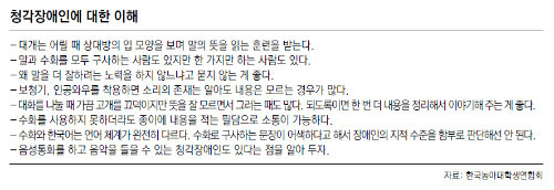 주의해야 할 사항도 있다. ‘일반인’이나 ‘귀머거리’ ‘불구자’와 같은 표현은 써선 안 된다. 청각장애인이 말을 할 수 있다고 해서 “너 청각장애인 아니지?”라고 물어도 곤란하다. 당사자에겐 불쾌하고 민감한 질문이다. 또 수화를 사용하는 청각장애인에게 “왜 구화(말)를 더 잘 익히려는 노력을 하지 않느냐”라고 질책하면 안 된다.