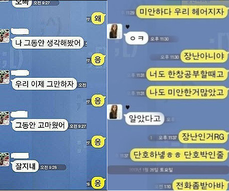 한편 최악의 이별통보 1위 조사 결과가 전해진 후 인터넷에서는 문자로 이별을 통보하는 다양한 사례들이 캡처 사진으로 올라오며 화제를 모으고 있다.
