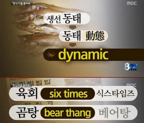 내용에 따르면 외국인 유동인구가 많은 서울역의 한 식당에서는 메뉴판 영어 설명에 곰탕을 동물 ‘곰’을 의미하는 ‘베어(bear)탕’ 이라고 소개하는가하면 육회는 여섯번을 의미하는 ‘식스 타임즈(six times)’로 표기하고 있다.