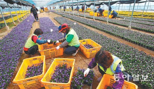 부산시 푸른도시가꾸기사업소 직원들이 4일 기장군 고촌양묘장에서 시민들에게 선보일 꽃 출하에 한창이다. 시는 이날 시내 거리를 단장할 봄맞이용 꽃 20만 송이를 구청별로 나눠줬다.