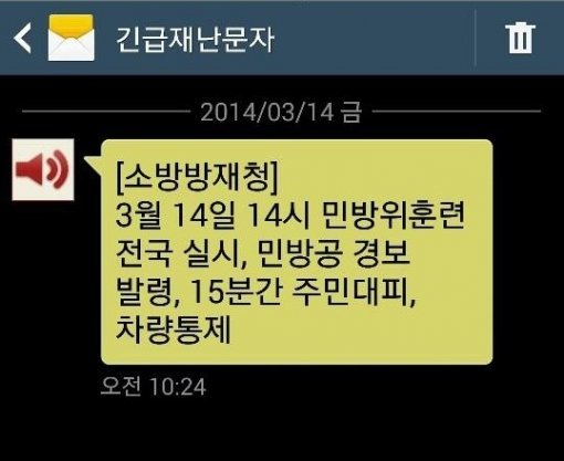 소방방재청은 14일 오전 긴급재난문자를 발송했다. 이에 네티즌 사이에서는 긴급재난문자를 받은 사실을 전파하며 민방위 훈련 소식을 공유하는 중이다.