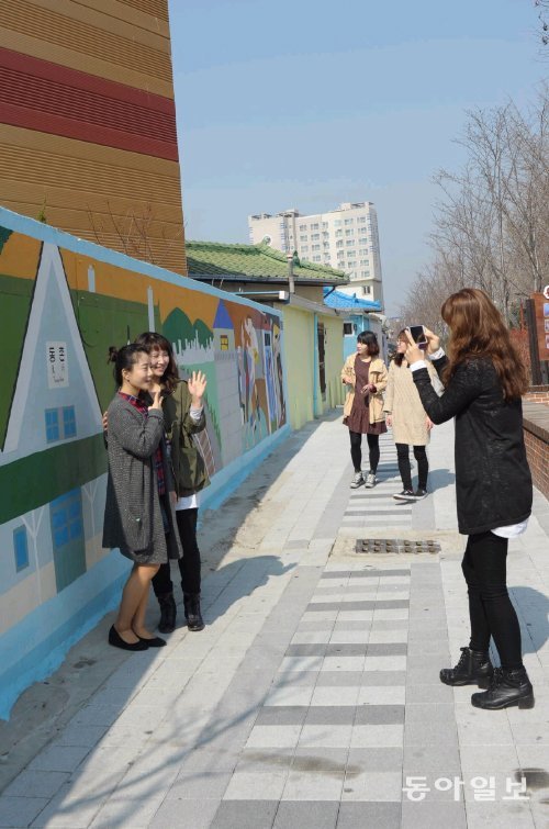 24일 대구 동구 동촌로 옹기종기 행복마을에서 시민들이 벽화를 배경으로 사진을 찍고 있다.