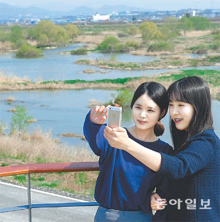 3일 대구 동구 대림동 안심습지를 찾은 관광객들이 전망대에서 기념사진을 찍고 있다.