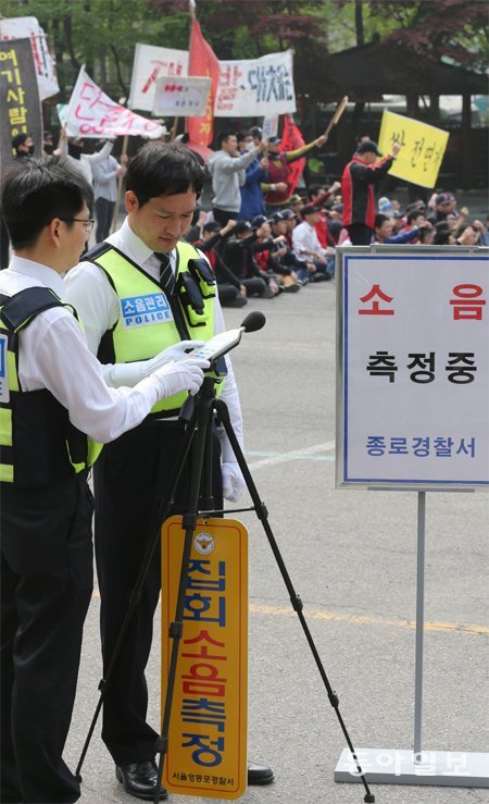도심에서 벌어지는 집회 시위의 소음을 전문적으로 단속하는 서울지방경찰청 소음관리팀이 15일 서울경찰청 기동본부에서 발대식을 가졌다. 소음관리팀은 20개 경찰기동대와 31개 경찰서에서 선발된 경찰관 244명으로 구성됐다. 이들은 집회 시위 현장에서 기준을 초과하는 소음이 발생하면 확성기 일시 보관, 앰프 전원 차단 등의 조치를 취하게 된다. 이날 소음관리팀원들이 소음 측정 시연을 하고 있다.