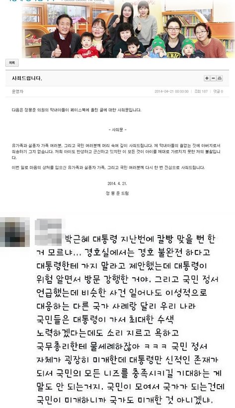 이 글은 정 씨가 세월호 참사 실종자 가족들이 현장을 방문한 박근혜 대통령과 정홍원 국무총리에게 거세게 항의한 장면을 두고 쓴 글로 보인다.