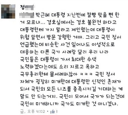 정몽준 의원의 막내 아들 정모 씨는 지난 18일 오후 자신의 페이스북에 “우리나라 국민들은 대통령에 소리 지르고 국무총리에 물세례하잖아. 국민이 모여서 국가가 되는건데 국민이 미개하니까 국가도 미개한 것 아니겠냐”는 글을 올렸다.