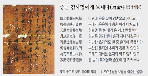 곧 폭설이 세상을 뒤덮을 날씨 속에서도 빛나는 달빛을 노래한 모습에선 전란을 예감하면서 ‘유비무환 임전무퇴’의 뜻을 가다듬는 무인의 자세가 엿보인다. 이러한 내용은 23일 출간되는 노 소장의 ‘이순신의 리더십’ 개정판에 실렸다.