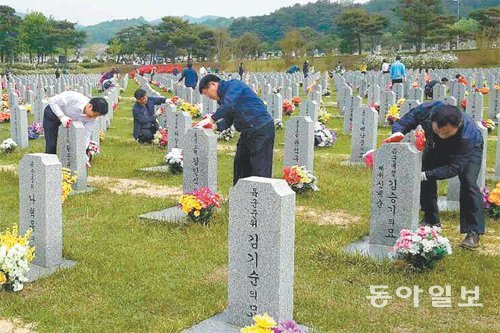 농협중앙회 충남지역본부(본부장 김병문) 임직원 160명은 26일 국립대전현충원을 찾아 헌화, 참배한 뒤 제2사병구역에서 비석을 닦고 주변을 정화하는 봉사활동을 펼쳤다. 충남농협은 당초 이날 임직원 체육행사를 개최할 예정이었지만 세월호 침몰 사고로 인해 취소하고 봉사활동으로 대체했다.