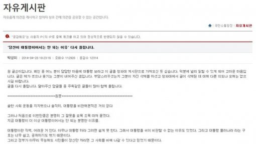 앞서 27일, 청와대 게시판에는 대통령을 비판하는 내용을 담은 글이 올라와 이슈를 일으켰다. 이에 부담을 느낀 게시자는 퍼온글이라며 자진 삭제했고 원작자 박성미 씨는 이후 청와대 게시판에 직접 자신의 글을 다시 올린 상황이다.