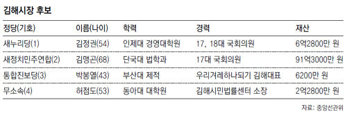 노무현 전 대통령의 고향이자 그가 잠들어 있는 경남 김해시(인구 52만3000명). 이곳의 현직 시장인 김맹곤 후보는 영남에서 유일하게 새정치민주연합 소속이다. 김해갑 선거구의 민홍철 의원도 같은 당이다. 그래서 그의 수성(守城) 여부가 관심을 끈다. 그를 위협하는 도전자는 새누리당 사무총장을 지낸 김정권 후보. 통합진보당 박봉열 후보와 무소속 허점도 후보도 열심히 뛰고 있다.