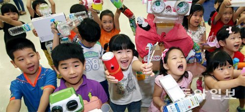 18일 서울 성동구 행당동 성동구청에서 어린이들이 폐품을 활용해 만든 장난감을 만져보고 있다. 이날 행사는 일회용 컵, 냄비 등의 폐품도 친환경 화분, 장난감 로봇 등으로 재생산될 수 있음을 보여주기 위해 마련됐다.