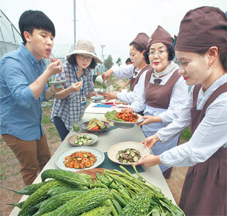 부산시농업기술센터 소속 우리음식 연구회 회원들이 15일 아열대 기능성 채소 재배기술 현장 평가회가 열린 부산 강서구 강동동 선암농원에서 아열대 채소로 만든 음식을 선보이고 있다.