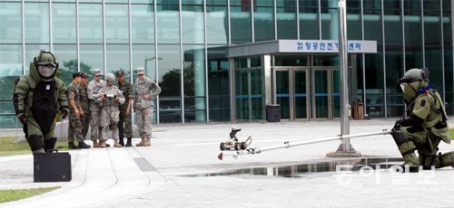 23일 인천 중구 인천국제공항공사 인재개발원에서 미8군 718부대, 인천경찰특공대 대원들이 여객터미널에 폭발물이 설치된 상황을 가상해 훈련하고 있다. 이번 한미 연합훈련은 9월 막을 올리는 인천아시아경기대회를 안전하게 치르기 위해 실시됐다.