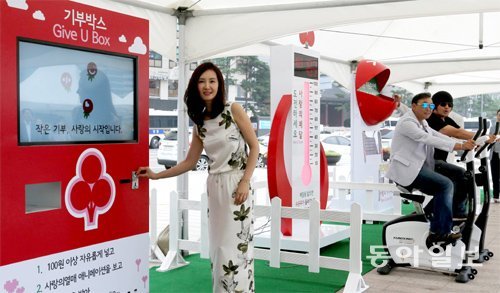 5일 오전 서울광장에서 사랑의 열매 사회복지공동모금회 주최로 기부체험가든 ‘Give U Gardn’ 오픈행사가 열려 홍보대사들이 놀이기구들을 직접 선보였다. 채시라 씨(왼쪽)는 동전을 넣으면 꽃씨 선물을 주는 기부박스를, 이봉주 씨(가운데)와 김보성 씨는 페달을 밟으면 온도탑 수은주가 올라가는 사랑의 사이클을 체험하고 있다.