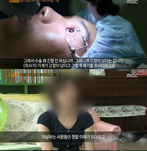 또 지난 2013년 라식 수술을 받은 박승찬 씨는 빛 번짐 부작용을 겪고 있다고 밝혔다. 그는 “눈 검사를 한 의사, 수술을 한 의사, 부작용 때문에 재수술을 해줬던 의사가 전부 다르다”며 “심지어, 재수술을 하던 도중 각막을 절개하고 나서 기계가 고장 났다고 임시 렌즈를 삽입한 채 방치했다”고 말하기도 했다.