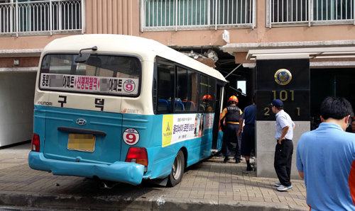23일 오전 9시 20분경 부산 사하구 장림1동 D아파트 101동 입구 출입문으로 김모 씨(65)가 운전하던 마을버스가 돌진했다. 버스는 출입문을 들이받은 뒤 앞부분이 아파트 출입구 절반쯤 들어가서야 멈춰 섰다. 이 사고로 승객 2명이 골절상을 입는 등 운전사 김 씨와 승객 등 12명이 중경상을 입고 인근 병원에서 치료를 받고 있다. 아파트 주민 50여 명도 놀라 대피하는 소동이 벌어졌다.