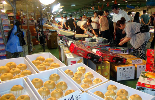 인천 남동구 구월동 농산물도매시장에서 시민들이 제수용 과일을 고르고 있다. 이곳에서는 요즘 전국에서 출하된 사과와 배 등이 저렴한 가격에 판매되고 있다. 김영국 동아닷컴 객원기자 press82@donga.com