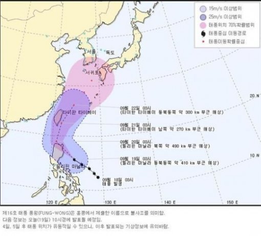 기상청은 “전국이 동해북부해상에 위치한 고기압의 영향을 받다가 점차 북상하는 제16호 태풍 풍웡 간접 영향을 받겠다”고 23일 오전 전했다.