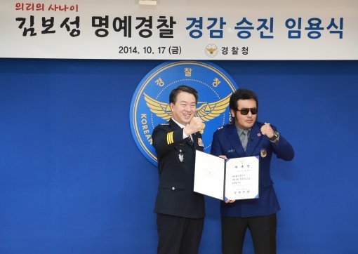 배우 김보성 씨(48)가 임기 2년의 명예경찰 경감에 위촉됐다. 경찰청은 17일 서울 서대문구 통일로 경찰청사에서 강신명 경찰청장이 주재하는 임용식을 열고 김 씨를 명예경찰 경감에 임명했다.