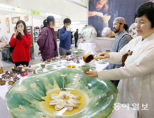 주말인 30일 부산 해운대구 벡스코에서 열린 2014 부산 차·공예박람회를 찾은 시민들이 한 부스에서 백련차를 시음하고 있다.