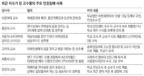 대학 교수들이 학생들을 상대로 성추행이나 인건비 횡령 등 각종 인권침해를 하는 사례가 끊이지 않고 있다. 최근 일주일간 교수의 성추행으로 언론에 오르내린 대학만 해도 서울대 고려대 중앙대 강원대 등 4곳에 이른다. 세종대에서는 4년 6개월간 대학원생 제자 15명의 수당을 가로챈 교수(46)가 2일 검찰에 구속 기소되기도 했다. 숙명여대에선 작곡과 교수 2명이 학생들에게 폭언과 부당행위를 일삼아 교내 징계위원회의 진상조사를 받고 있다.