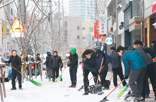 8일 대구 중구 달구벌대로 주택가에서 시청 직원들이 눈을 치우고 있다. 이날 대구에는 3cm가량의 눈이 내렸으며 일부 시민이 출근길 교통 정체로 불편을 겪었다.