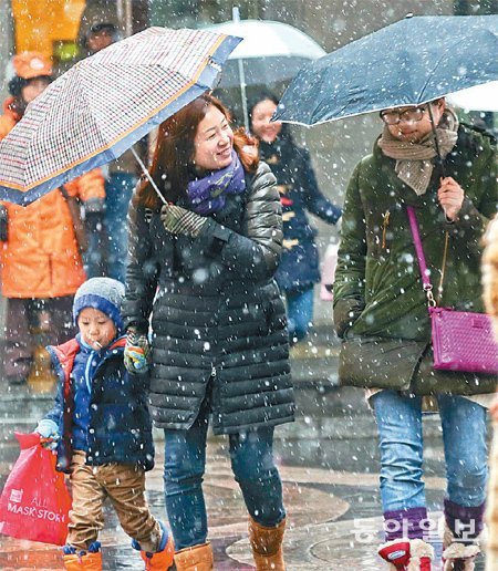 15일 서울에 함박눈이 내린 가운데 시민들이 우산을 쓰고 중구 명동거리를 걷고 있다. 기상청은 16일 오전까지 전국 곳곳에 눈이 내린 뒤 매서운 한파가 몰아칠 것으로 내다봤다.