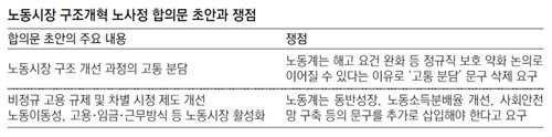 전문가그룹과 정부는 당초 합의문 초안에 해고 요건 완화, 직무성과급 중심으로의 임금체계 개편 등을 담는 방안을 검토했지만, 노동계의 반발을 고려해 ‘노동시장 구조개선 과정에서 (노사가) 고통을 분담한다’는 문구를 제시했다. 그러나 한국노동조합총연맹(한국노총)은 ‘고통 분담’이란 문구가 해고 요건 완화 등 정규직 보호 축소 논의로 이어질 수 있다며 이를 거부했고, 오히려 △동반성장 △사회안전망 확충 △소득분배율 개선 같은 문구를 넣어야 한다고 주장했다. 이에 한국경영자총협회가 강하게 반대하면서 특위는 난항을 거듭했다.
