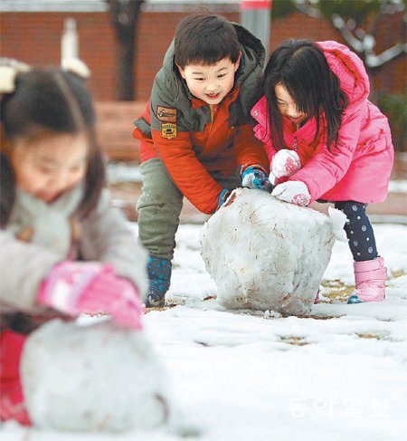 주말 동안 함박눈이 내린 22일 광주 북구의 한 어린이집에 수북이 쌓인 눈 위에서 어린이들은 마냥 신이 나 눈사람을 만들며 즐거운 시간을 보내고 있다.