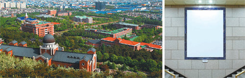 건물이 숲 속에 조화롭게 배치됐다(왼쪽 사진). 계명대 본관에 걸려 있는 ‘타불라 라사(TABULA RASA·아무것도 쓰여 있지