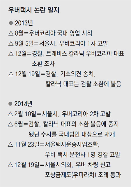 검경은 지난해 9월 “우버가 불법영업을 하고 있다”는 서울시의 고발에 따라 수사를 벌여왔다. 경찰은 같은 해 12월 우버와 칼라닉 대표를 기소의견으로 검찰에 송치했고, 검찰은 칼라닉 대표가 미국에 있다는 이유로 기소를 중지했다가 올해 6월 한국지사 관계자 등을 대상으로 수사를 재개해 기소를 결정했다.