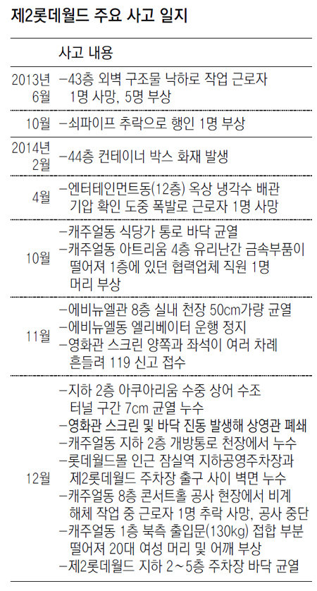 제2롯데월드의 안전 문제는 어제오늘의 일이 아니다. 지난해 10월 14일 임시 개장 이후 10여 건의 크고 작은 사건 사고가 발생했다. 에비뉴엘관 8층 천장에서 50cm가량 균열이 나타났고 지하 아쿠아리움 수중터널 구간에서도 7cm 정도 균열이 발생해 물이 샜다. 영화관에서는 진동 때문에 상영관이 폐쇄되기도 했다. 또 캐주얼동 콘서트홀에서는 비계 해체 작업을 하던 인부가 추락해 숨지는 사고도 있었다.