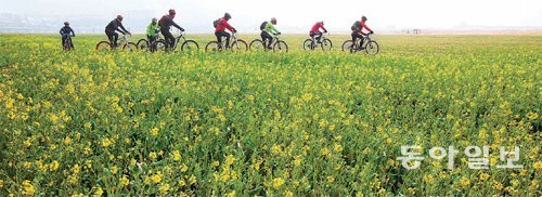 1일 부산 강서구 대저생태공원에서 자전거 동호인들이 벌써 꽃이 피기 시작한 유채꽃 길 사이를 지나며 봄기운을 즐기고 있다. 4월 4일부터 이곳에서는 유채꽃 축제가 열릴 예정이다.