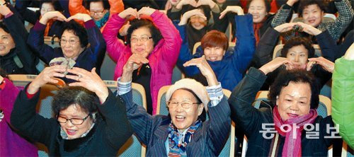 3일 서울 마포구 마포아트센터에서 열린 양원초교 입학식에서 역대 최고령 입학생인 김말순 할머니(90·앞줄 가운데)와 어르신들이 양팔로 하트 모양을 만들며 즐거워하고 있다. 양원초교는 성인 대상의 학력 인정 학교다.