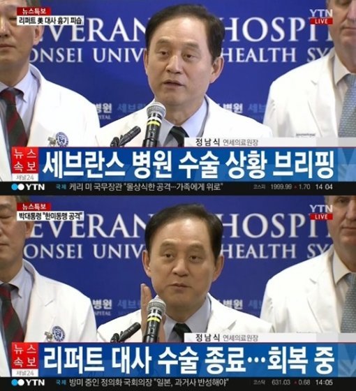 5일 오후 2시 진행된 ‘리퍼트 대사 피습’ 수술 상황 브리핑에서 정남식 연세의료원장은 “리퍼트대사는 오늘 오전 9시 30분 병원에 도착해 바로 수술을 받았다. 2시간 30분 동안 수술이 진행됐고, 매우 성공적으로 끝났나”고 밝혔다.