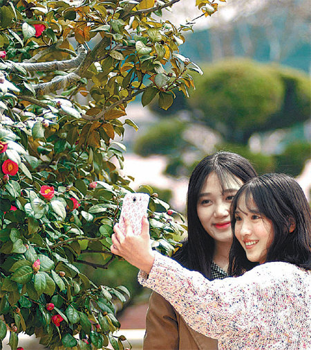 23일 대구 북구 영진전문대 캠퍼스에서 학생들이 꽃망울을 터뜨린 동백 사진을 찍고 있다.