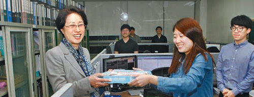 개교 이래 61년 동안 여성으로는 처음으로 총장 자리에 오른 인하대 최순자 총장(63·사진 왼쪽)이 학생, 교직원과의 소통을 위해 손수 다양한 이벤트를 마련하고 있다. 최 총장은 1일 오후 8시경 학업과 연구에 몰두하고 있는 공대, IT공대, 자연대, 문과대, 사범대를 잇달아 찾아 불이 켜져 있는 연구실마다 노크를 했다. 학생과 교수들이 예고 없는 총장의 방문에 깜짝 놀라자 최 총장은 이들을 격려하며 미리 준비한 피자를 선물했다. 최 총장은 “연구에 매진하는 여러분을 보니, 미국 유학 시절 늦은 시간 아르바이트를 마치고 다시 대학으로 돌아와 새벽까지 학업과 연구에 매달렸던 기억이 떠오른다. 즐거움으로 학업에 정진하면 놀라운 성과가 미래에 펼쳐질 것”이라고 격려했다.