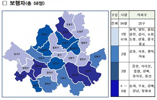보행자 사망사고의 경우에는 전체 사망사고(94명)의 62%를 차지하였으며, 사망사고가 많은 지역에서 주로 발생하고 있으며, 특히 영등포와 강북구는 등록 인구에 비해 보행사망사고도 많이 발생하여 보행사고에 취약한 것으로 분석됐다.