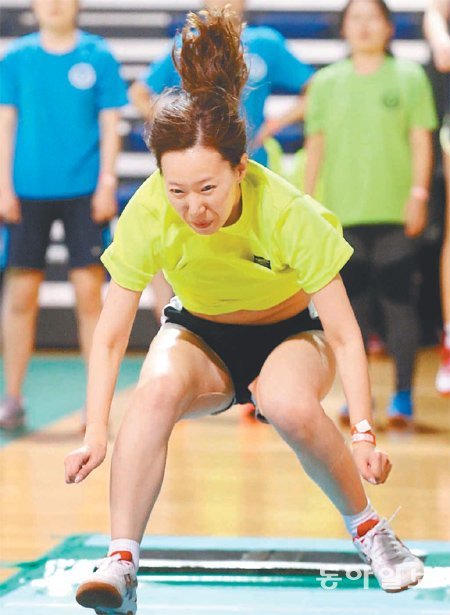 6일부터 3일간 열리는 2015 부산지방소방공무원 신규채용 제2차 체력시험이 열린 부산 강서구 강서실내체육관에서 여성 지원자들이 체력시험을 통과하기 위해 안간힘을 다하고 있다.