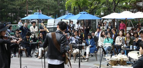 12일 서울 종로구 세종문화회관 뒤 예인마당에서 펼쳐진 인디뮤직 그룹 ‘이채언루트(Echae en Route)’의 공연을 많은 시민들이 즐기고 있다. 이날부터 29일까지(월요일·주말 제외) 예인마당에서는 점심시간 직장인을 위한 ‘정오의 예술무대’가 열린다.